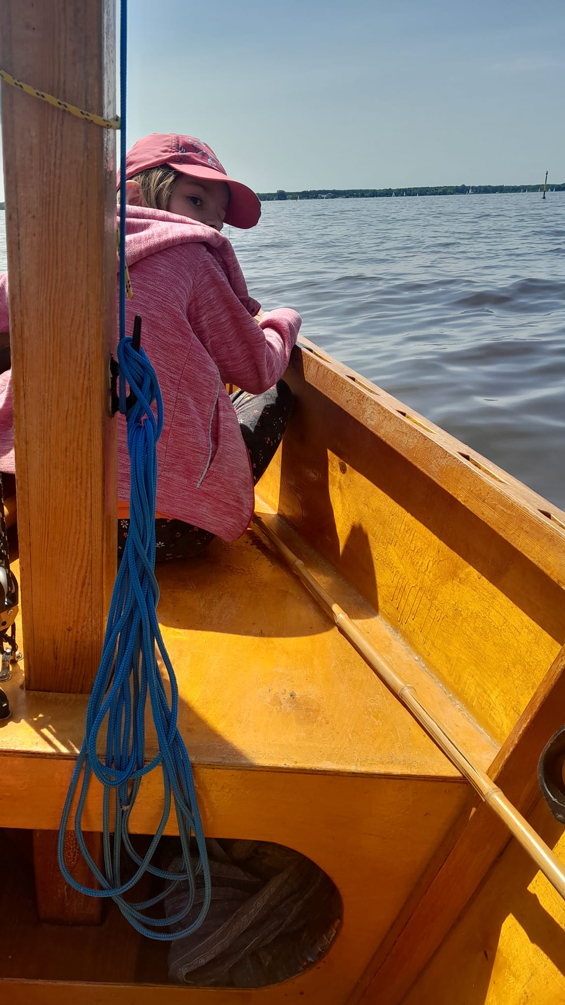 Sprawnie zapakowaliśmy nasze bagaże, zaokrętowaliśmy załogę, czyli Misia, Gosię, Grzesia i Kasię i odeszliśmy od brzegu w lekkim podmuchu. Kilkaset metrów od przystani, wiatr zaczął płatać figle - zmieniać kierunki i zdychać do zera. Zamierzaliśmy jednak, odbyć fajny rejs i odwiedzić, a przynajmniej z bezpiecznej odległości obejrzeć, miejsce naszego stacjonowania w ostatnich sezonach. Kierunek wiatru wydawał się być sprzyjający - w obie strony i liczyliśmy, że się taki utrzyma. Chwile, kiedy wiatr wiał z siłą dwójki, były naprawdę przyjemne i żegluga dość szybka. Był nawet moment, w którym mogliśmy docenić szybkość naszego, małego GIS-a "Uitwaaien" - kabinowa łódź typu Raja, która złapała ten sam podmuch i szła naszym śladem, nie zdołała nas dogonić i została daleko w tyle. A przecież, nasz "Uitwaaien", nie jest w trymie regatowym... No, dobra - ta Raja, raczej też w nim nie była! Niestety, ale chwile przyjemnego wiatru i przyjemnej, dość szybkiej żeglugi, były raczej krótkie, przerywane długimi okresami ciszy, w których bujaliśmy się nierównomiernie, na falach wygenerowanych przez motorówki i skutery wodne. Dość powiedzieć, że na załączonym niżej wideo, zrobionym z ponad półtoragodzinnego "materiału zdjęciowego", umieściłem wszystkie chwile z wiatrem! 10 minut wiatru, na półtorej godziny żeglowania! W sumie, rejs trwał ponad dwie i pół godziny i mieliśmy szczęście, że nie musieliśmy wiosłować w drodze powrotnej. Generalnie, wnuczętom się podobało - pewnie, jako odskocznia od codziennych, szkolnych obowiązków. Po raz kolejny pokazaliśmy, że pomimo małych rozmiarów, Goat Island Skiff "Uitwaaien", jest fajną łodzią rodzinną, dla dwóch osób dorosłych, dwojga dzieci i średniej wielkości psa. Tym razem, nie było nauki sterowania, bo jak się uczyć, sterowania i odgadywania skąd wiele wiatr, skoro chwilami, wcale nie wieje i co chwila próbuje zawiewać z zupełnie innej strony? Zresztą, sam skipper, miał momentami trudności z przewidywaniem kierunku wiatru, który się zbliżał po dłuższej chwili ciszy, robiąc ślad na wodzie... Śledzącym nas ormowcom, zwracam uwagę, że dzieci miały założone kamizelki asekuracyjne z zapiętymi pasami krokowymi - czasami niewidoczne, bo na wierzchu, dzieci były ubrane w bluzy, bo mówiły, że jest im chłodno.